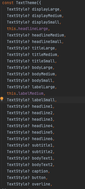 - TextTheme() 안에 여러가지 파라미터를 넣을 수 있다. 확인해보려면, Go to Declaration or Usages 를 봐보자!