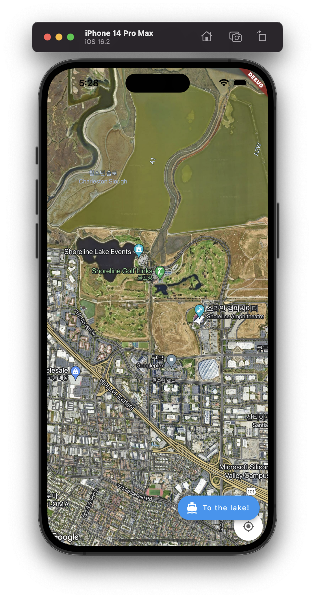 도에 맞게 지도가 나오고 To the lake! 버튼이 작동되는 것을 볼 수 있다.